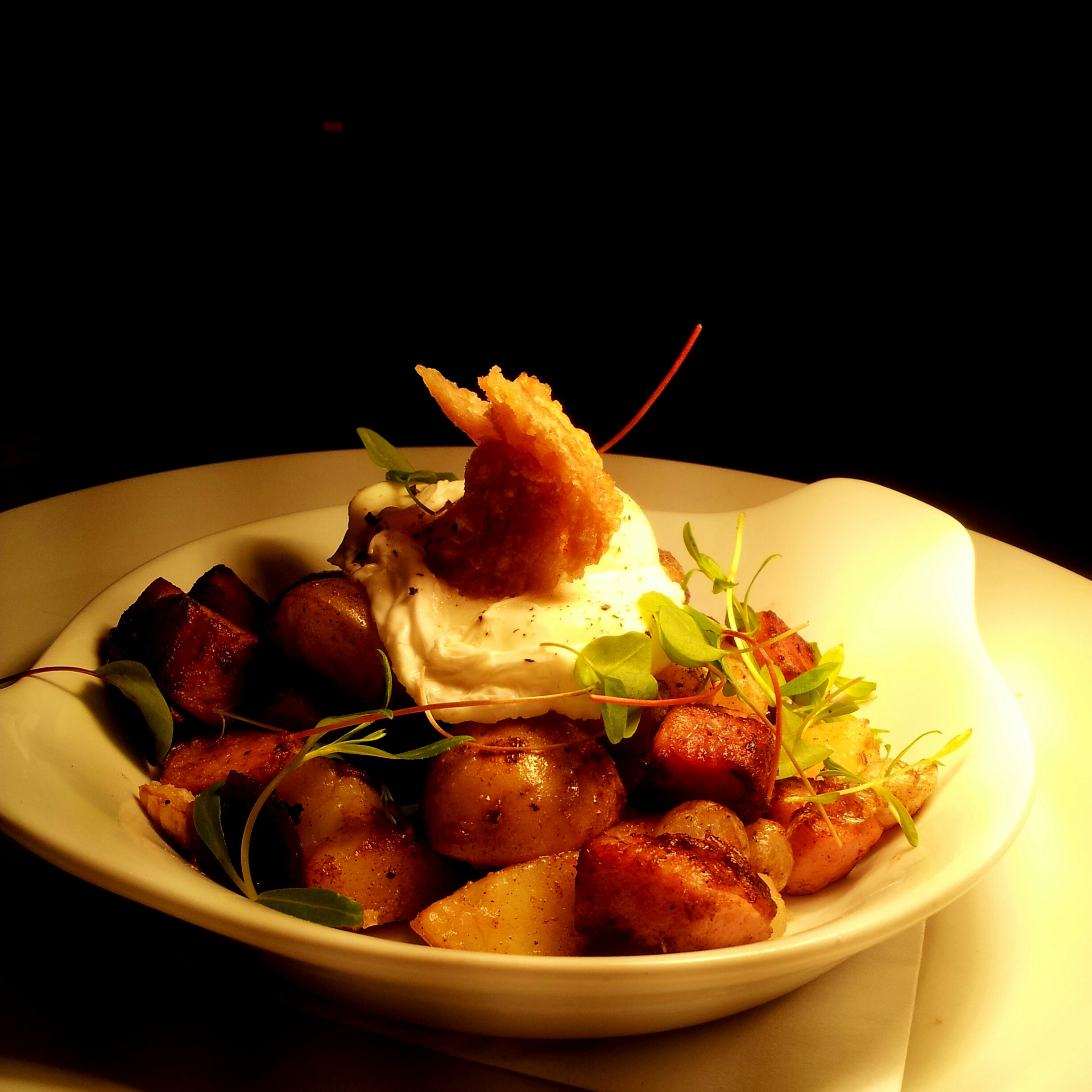 Cover the pan to keep everything warm while you poach the eggs in simmering water. To serve, spoon the hash onto warm plates and place the poached eggs on top.