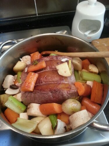 Using a big oven-proof pan of caserole pot that can go on the hob, heat a little oil and then sear the joint on all sides. Remove from the pot and add the carrots, celery, turnip or swede and the shallots or onions. Keep the heat reasongably high and allow the vegetables to brown a little here and there, giving them a stir and turn every now and then. Remove them too and then return the meat to the pot, add the browned vegetables along with the mushrooms, herbs and liquid and bring to a simmer while adding a little salt and pepper. Once simmering, place in the oven for around three hours.