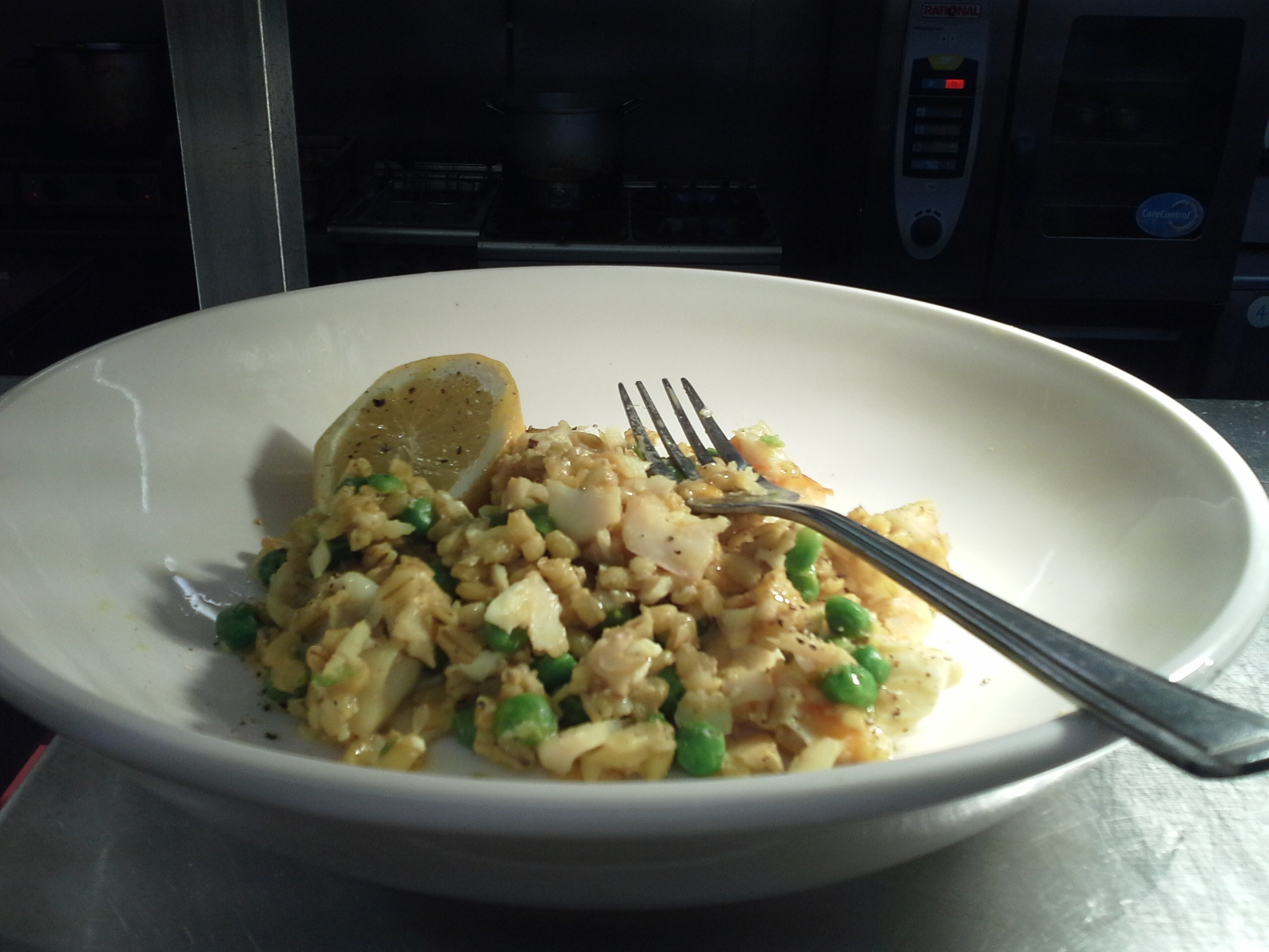 Add the flaked haddock, chopped egg and peas to the barley and warm everything through, tasting before adding pepper and any necessary salt. Serve with a wedge of lemon.